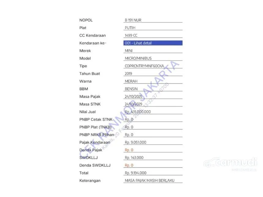 Plat : B 191 NUR ( Ganjil Jakarta)