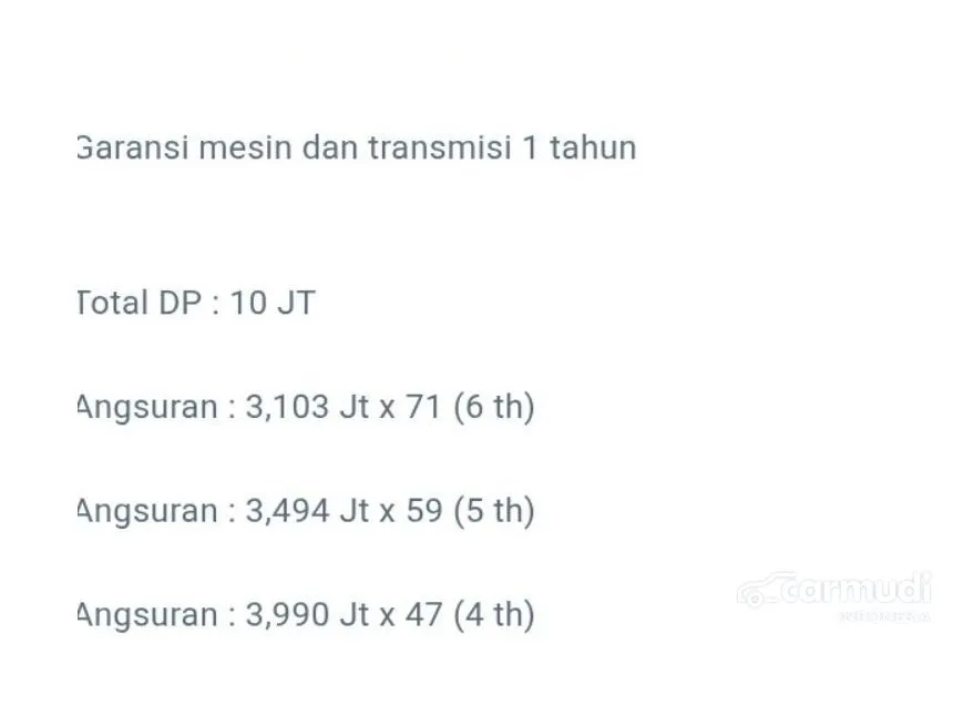 Besaran nilai uang muka dan angsuran bulanan ini hanya berupa ilustrasi saja dikarenakan adanya komponen biaya tambahan untuk asuransi dan jasa lainnya dari lembaga keuangan yang Anda pilih.